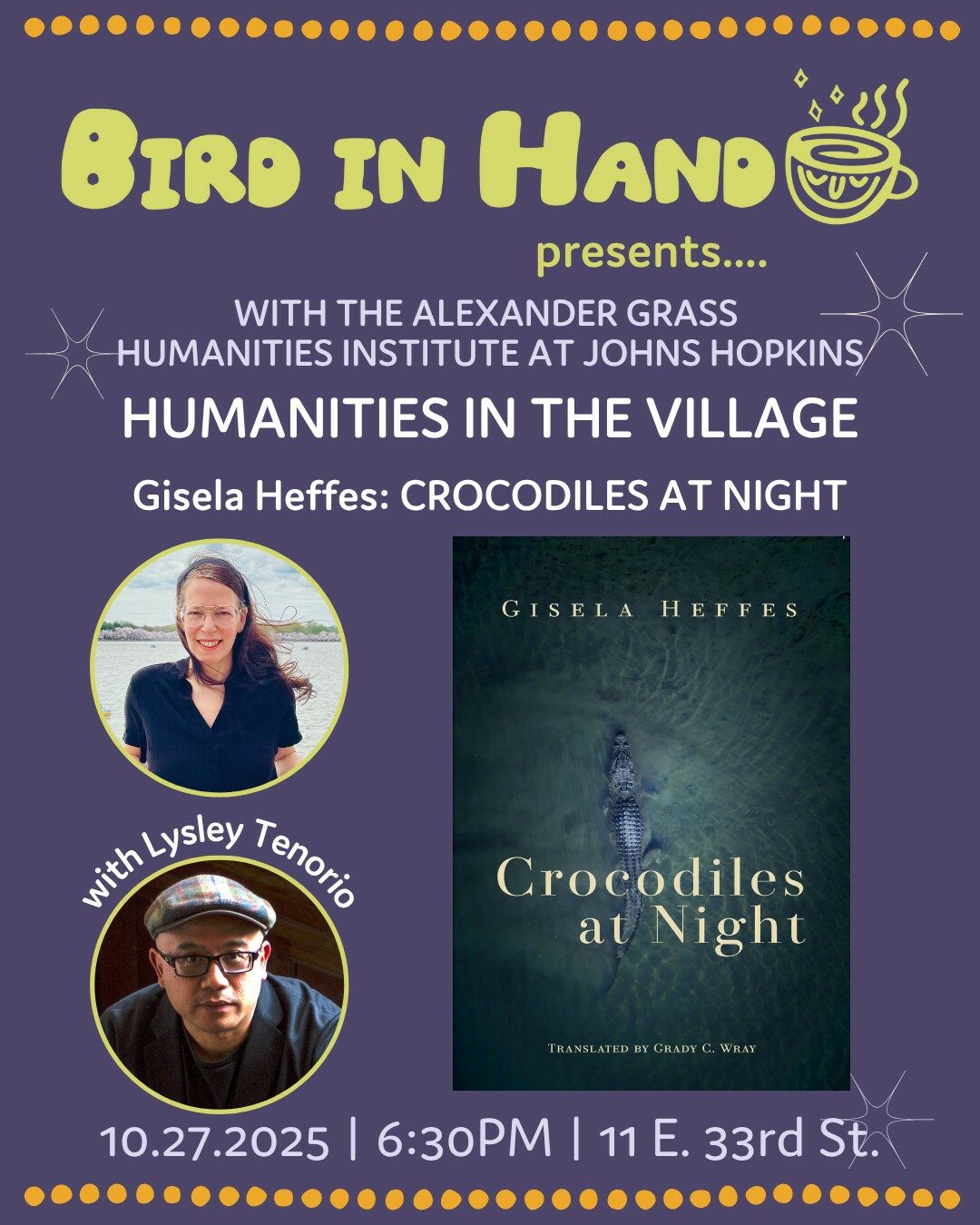 Presenting Humanities in the Village, an event series in partnership with the Alexander Grass Humanities Institute at Johns Hopkins University, which aims to make scholarship publicly accessible. For this October edition, we are thrilled to welcome Gisela Heffes in celebration of her new novel CROCODILES AT NIGHT, out...