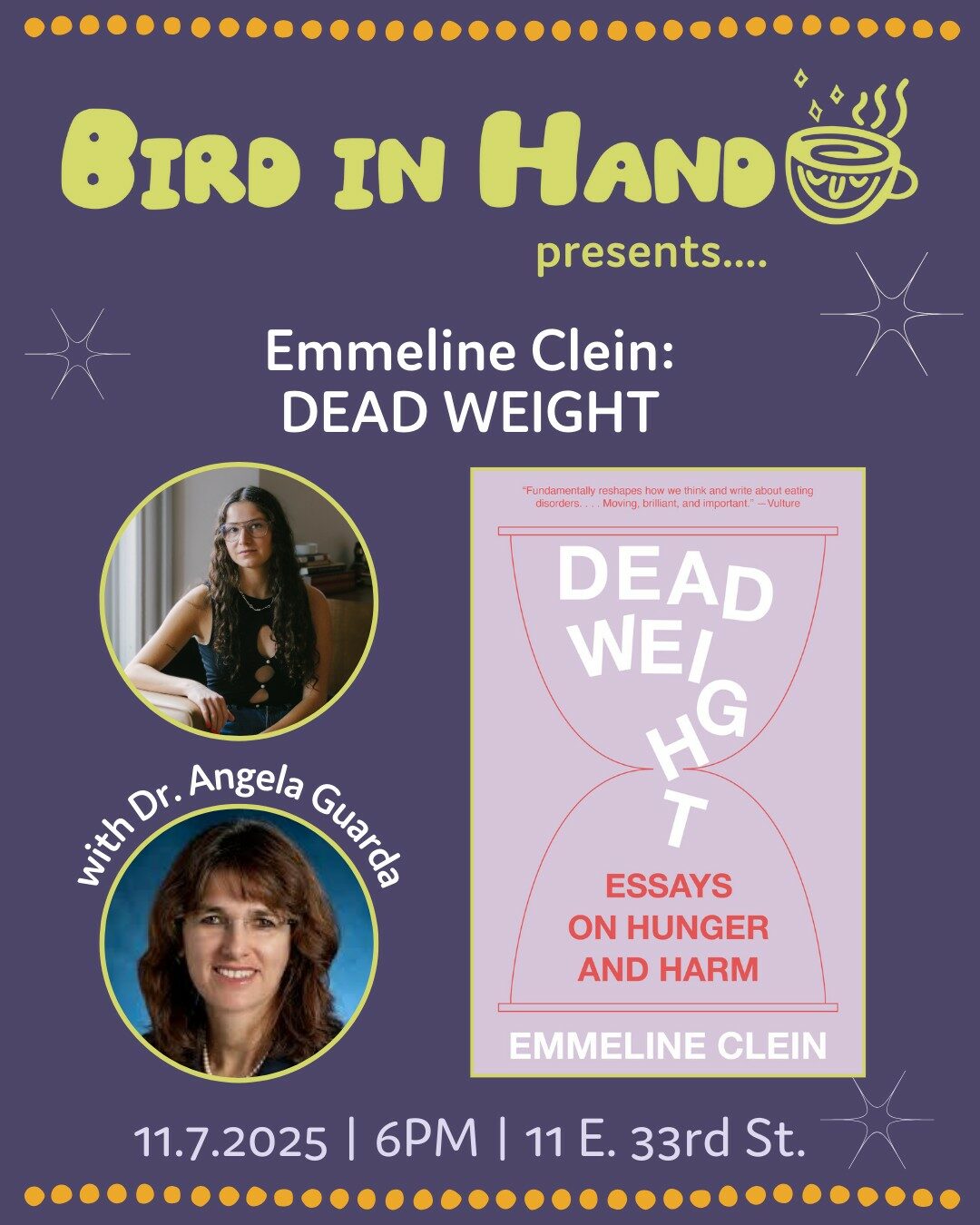 Bird in Hand hosts a conversation between Emmeline Clein, author of the "fiercely compassionate" book on the dark underbelly of Western beauty standards, Dead Weight, and psychiatrist Dr. Angela Guarda. Click here to RSVP! Click here to order the book! Dead Weight draws on a kaleidoscopic array of sources--from cult classic...