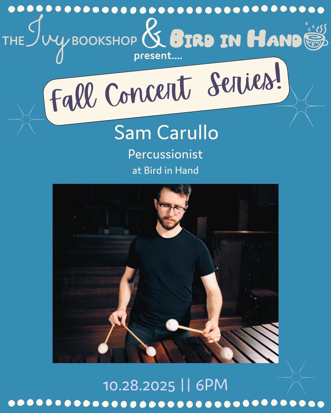Bird in Hand hosts local percussionist Sam Carullo for a solo concert during our fall concert series! Experience our full menu of cocktails and coffee for this happy hour concert. Doors open at 5:45, concert begins at 6:00. This concert series is free, but cash donations will be...