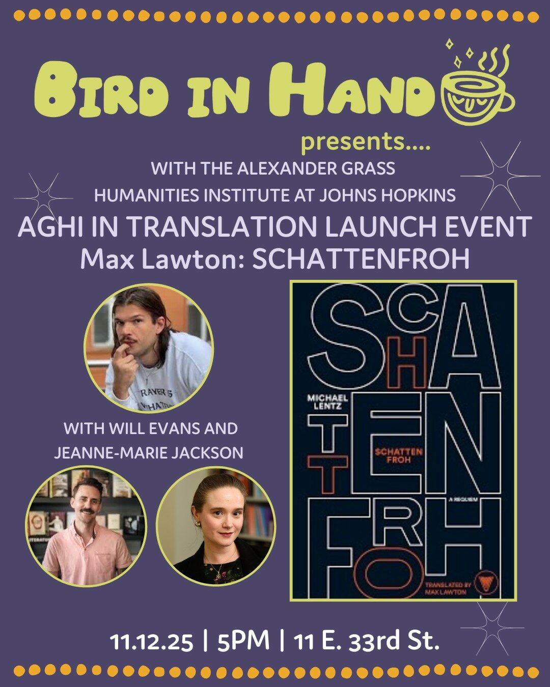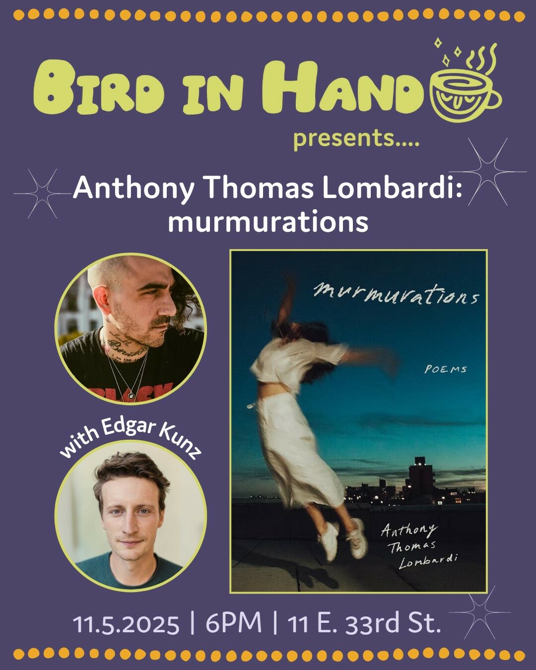 Sunday November 9, 2025 at 4pm, The HOT L Poets Series continues with poets Rick Hilles & Samyak Shertok! We're moving to Bird in Hand Coffee & Books at 11 E. 33rd St. to be indoors for the cooler season. The reading includes an open mic so bring...