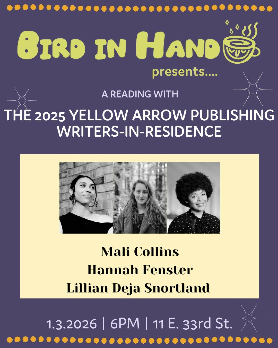 Yellow Arrow Publishing presents their 2025 Writers-in-Residence: Mali Collins, Hannah Fenster, and Lillian Deja Snortland. Every writer has a story to tell and every story is worth telling. Since 2019, Yellow Arrow Publishing has been proud to offer a residency program that enables us to support, uplift, and...