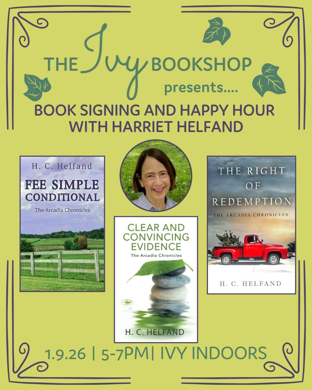 Longtime lawyer and judge Harriet Helfand weaves intrigue, humor, and a touch of romance with legal themes in her Arcadia Chronicles series– a combination we find endlessly interesting and fun. Come on by the Ivy between 5-7pm on Friday, January 9th to meet the author, have your book signed, and enjoy a drink with friends as we celebrate these books.