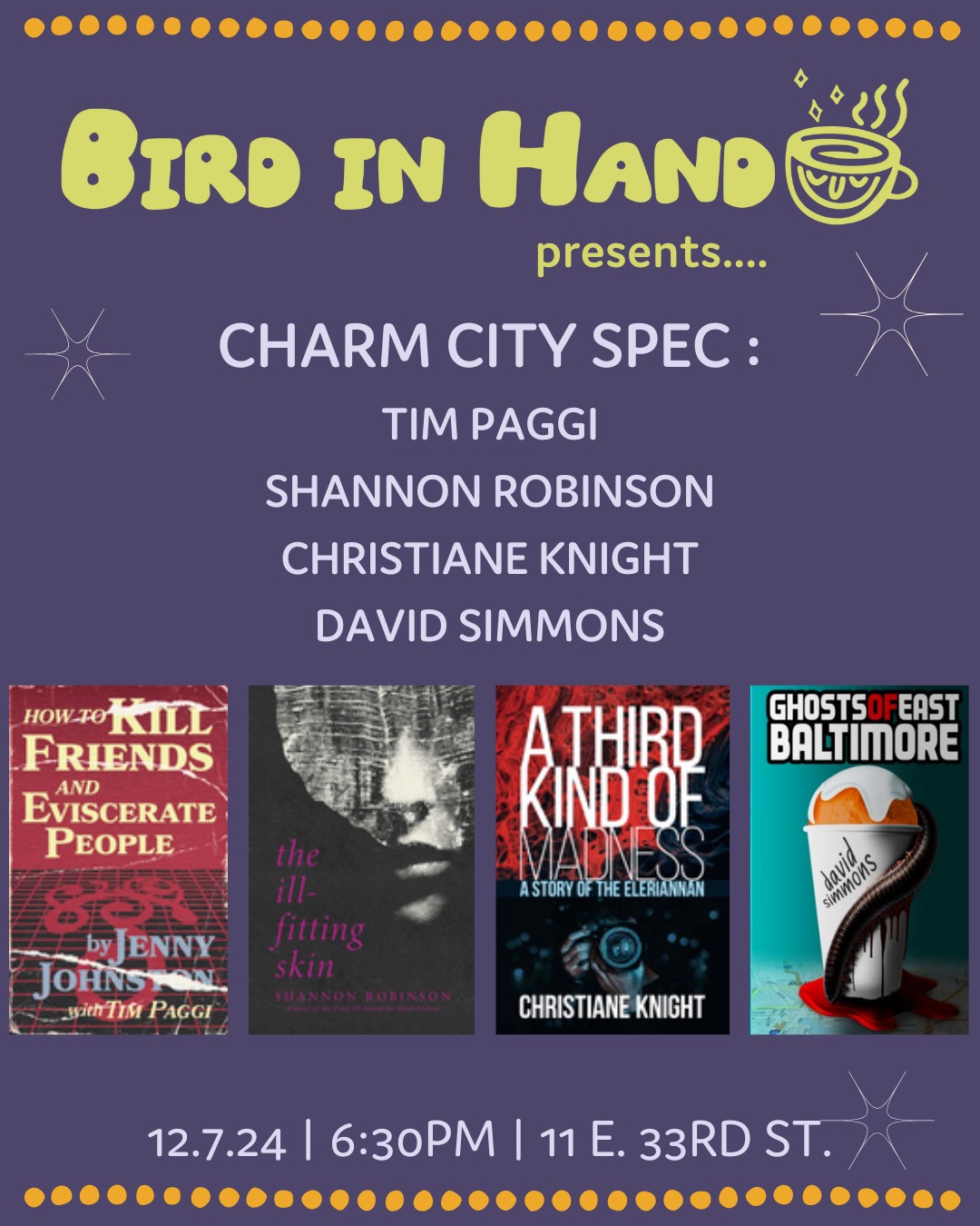 The winter edition of Charm City Spec is here, at Bird in Hand on the evening of December 7! For this episode of Baltimore’s longstanding speculative fiction reading series, you’ll hear from Tim Paggi, Shannon Robinson, Christiane Knight, and David Simmons. Whether it’s your first time at the series or you’ve been coming for years, we can’t wait to see you for what is always a warm, wonderful evening in support of exciting authors. Books and refreshments will be available at the event.