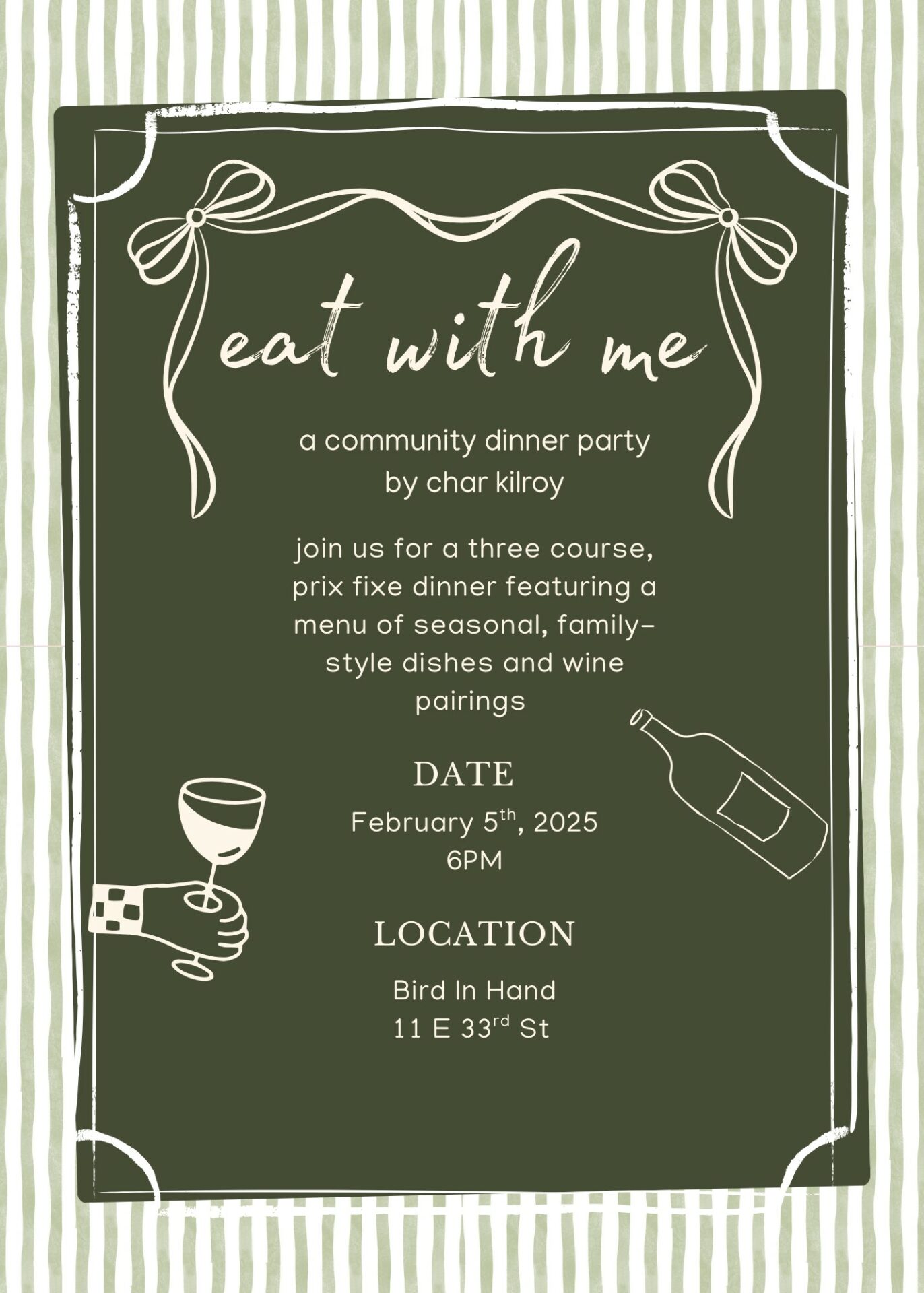 The first of (hopefully many) Eat with Me dinner parties will feature a 3-course, preset menu full of simple, seasonal dishes.