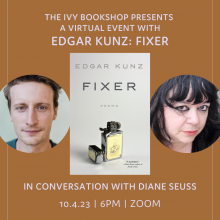 Join us in celebrating beloved Baltimore-based poet Edgar Kunz’s new poetry collection, FIXER, with a conversation with Kunz and Diane Seuss, author of frank: sonnets! Seuss’ enthusiastic blurb graces the cover of FIXER and we are thrilled to present this special chance to hear the two poets discuss the collection in real time.