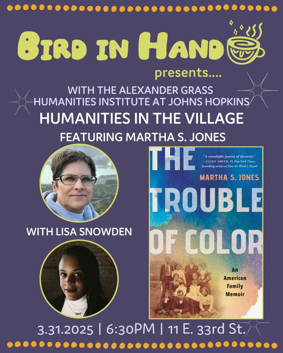 March’s event features Dr. Martha S. Jones, and her new book THE COLOR OF TROUBLE: AN AMERICAN FAMILY MEMOIR! An “intimate and searching” (Natasha Trethewey, New York Times-bestselling author of Memorial Drive) memoir of family, color, and being Black, white, and other in America, from “one of our country’s greatest historians” (Clint Smith, #1 New York Times-bestselling author of How the Word is Passed).