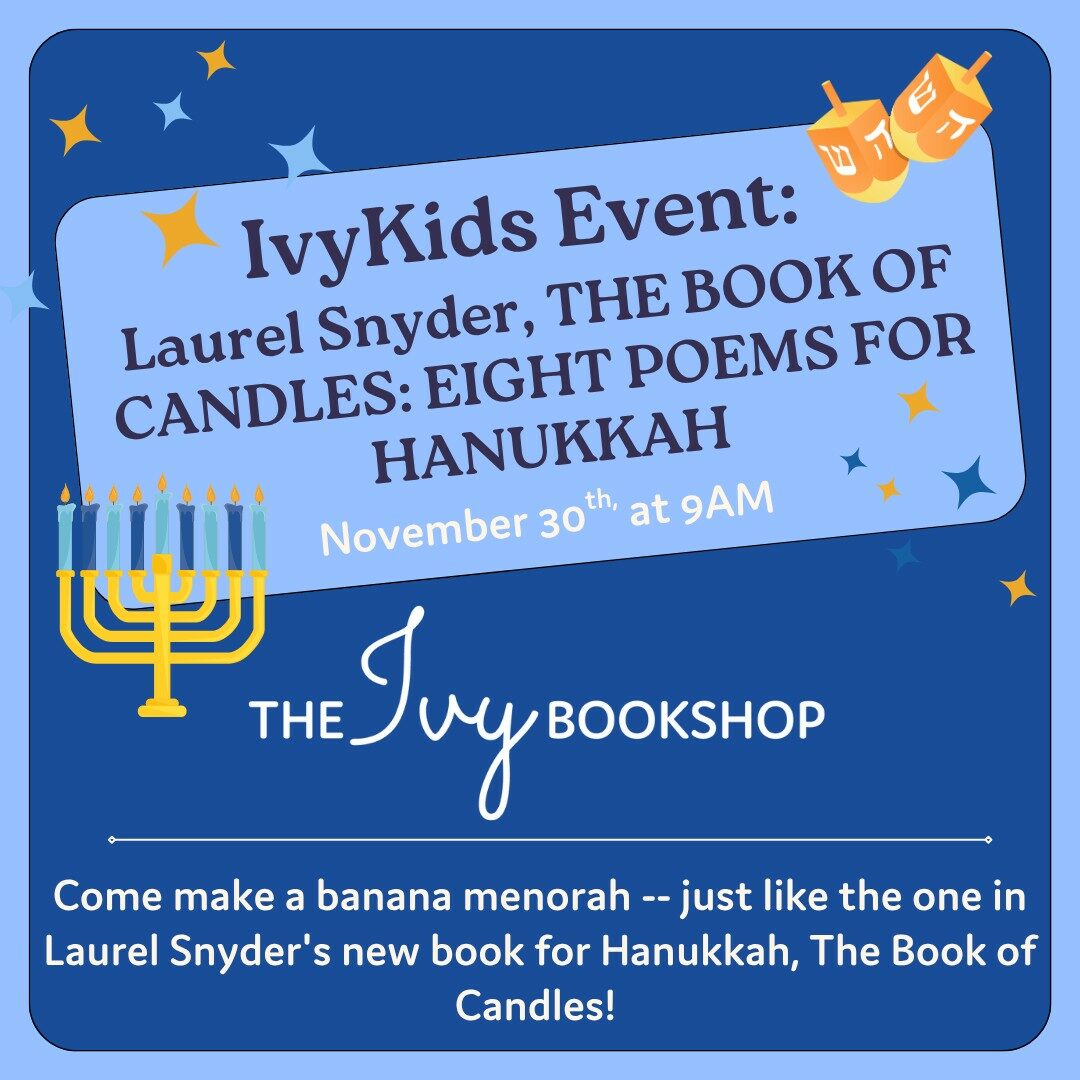 Our monthly IvyKids Series will take place on Sunday, November 30th, indoors at The Ivy with author Laurel Snyder, where we’ll have a storytime and craft, and get in the holiday spirit.