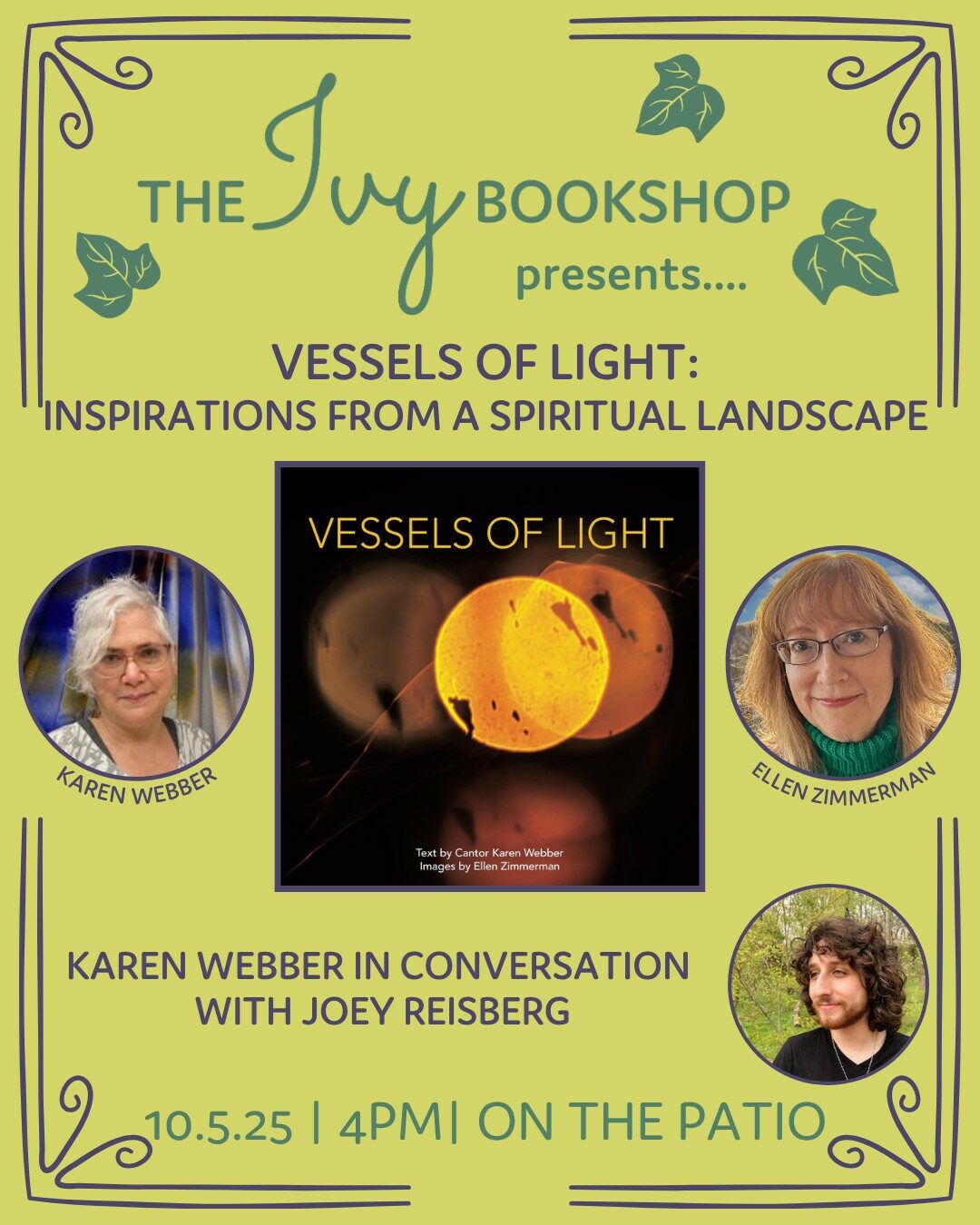 The Ivy invites you to a book event to celebrate the publication of Vessels of Light: Inspirations from a Spiritual Landscape by photographer Ellen Zimmerman and poet Cantor Karen Webber. Karen will be in conversation with local poet and translator Joseph Reisberg about accessing the spiritual world through words, and the two will also share thoughts from Ellen Zimmerman, the book’s co-author.