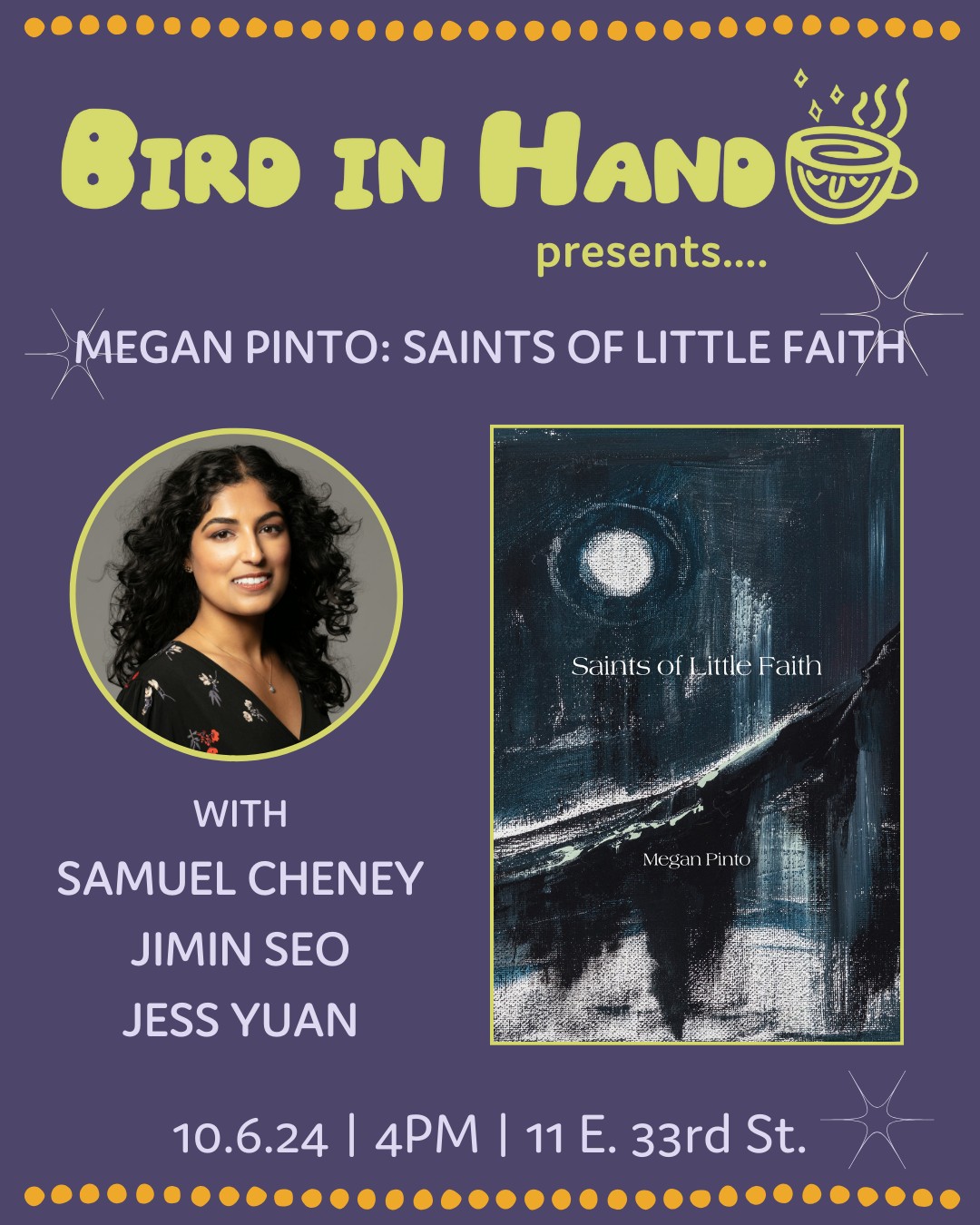 Presenting a Sunday afternoon of poetry at Bird in Hand, celebrating Megan Pinto’s debut collection Saints of Little Faith! “These are beautifully rendered ruminative and thoughtful coming- of-age poems,” says Victoria Chang, and we couldn’t agree more. Exciting for widely-read poetry lovers or those looking to get into contemporary poetry, Saints of Little Faith is a fine-tuned collection of meditative transformations that engage with South Asian experiences of addiction, domestic violence, and mental illness, refusing to ignore narratives treated as unspeakable and overlooked by the English canon.