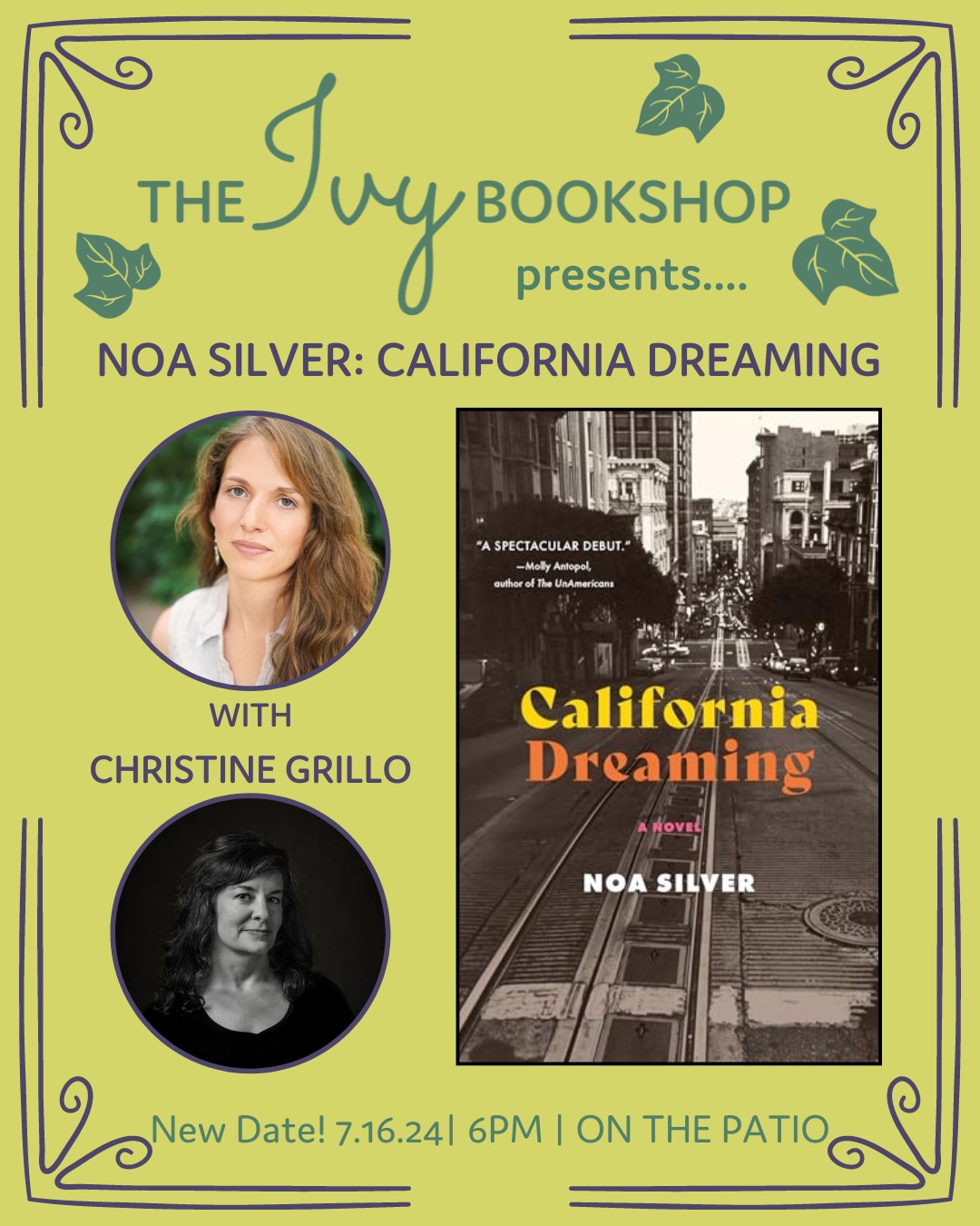 You’re invited to a conversation about debut novels, young people finding meaning in their lives, questions of family and responsibility, and– engaging summer reading! Noa Silver’s new novel, CALIFORNIA DREAMING, is a coming-of-age story between the Occupy and #MeToo movements and against the backdrop of the 2016 election and California’s ever-worsening fire season. It’s a book about how we come to understand our motivations and values, and we’re lucky to welcome Noa Silver to discuss her writing process on this July evening.