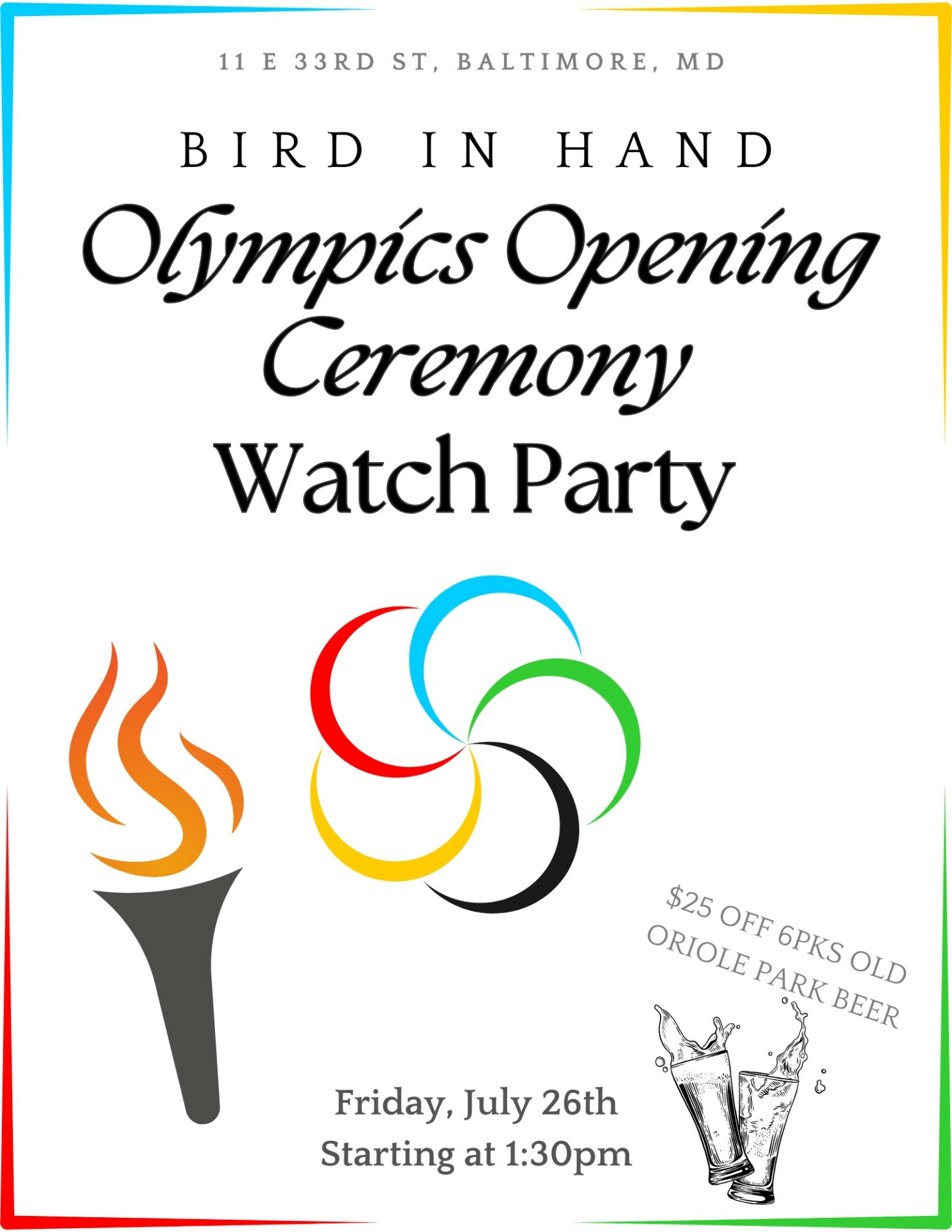 We’ll be streaming the opening ceremony of the 2024 Olympics at Bird in Hand! Join us for a coffee, beer (25% off 6-packs of Old Oriole Park), or a bite.