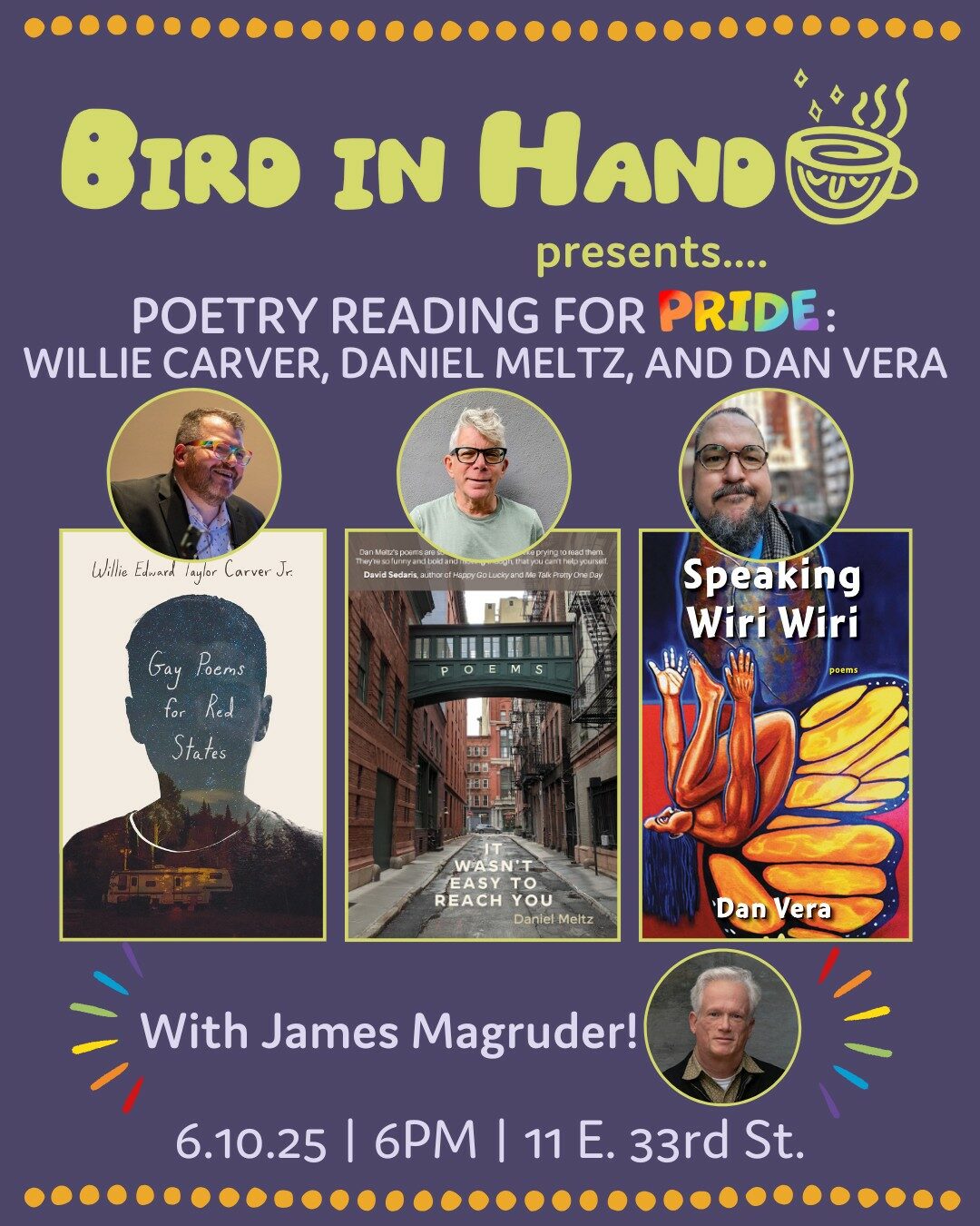 Beloved local writer James Magruder hosts 3 exciting poets for a reading for Pride Month: Willie Carver, Dan Meltz, and Dan Vera! Their books– Gay Poems for Red States, It Wasn’t Easy to Reach You, and Speaking Wiri Wiri, among others– explore the complexities of navigating multiple identities, all with distinct forms of earnestness and wit. They’re intimate, they’re funny, and they reach for something real. We hope you will join us for this affirming event.