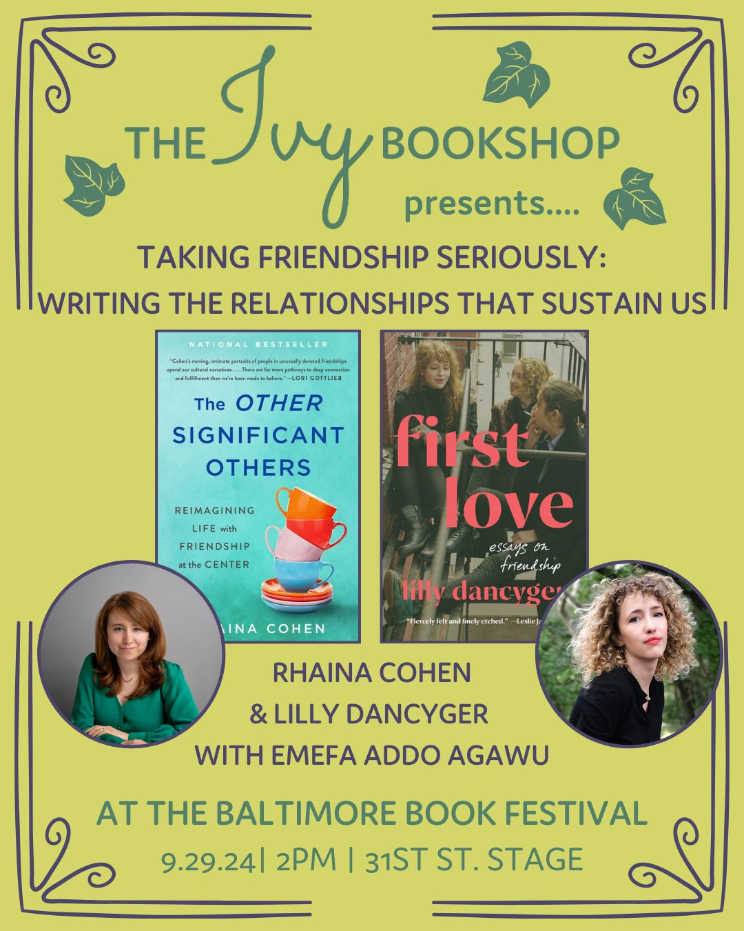 For this 2pm panel, we’re so excited to be joined by Rhaina Cohen, author of The Other Significant Others: Reimagining Life with Friendship at the Center, and Lilly Dancyger, author of First Love: Essays on Friendship, who will discuss their recent works of nonfiction in conversation with Baltimore-based writer and editor Emefa Addo Agawu.