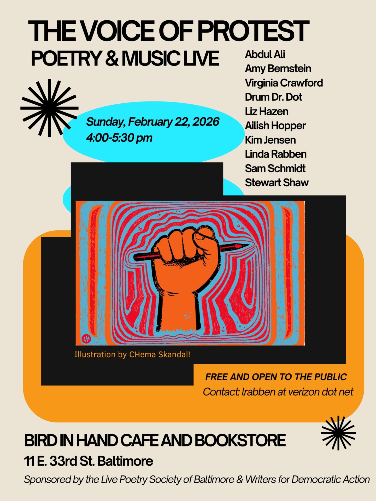 The Live Poets Society of Baltimore presents occasional readings by local poets accompanied by local musicians. We are so excited for their event held in partnership with Writers for Democratic Action and hosted at Bird in Hand!